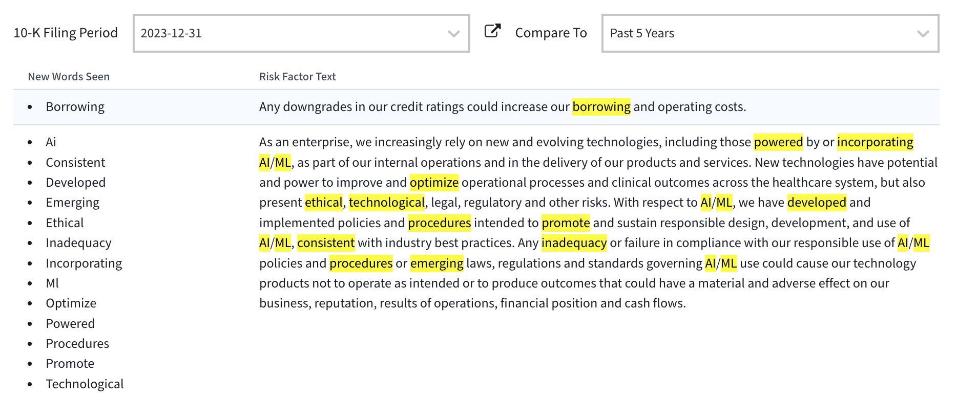 To do this, the platform analyzes every risk disclosure section to identify rare or never before used words. These novel words can modify existing risk factors (e.g. “rising” interest rates) or expose entirely new risks (e.g. “generative” AI). This method provides potent insights, revealing unique challenges at the individual company level, such as a healthcare grappling with risks related to the banking system when events like the Silicon Valley and Signature Banks occured. Simultaneously, it unveils overarching trends across a spectrum of companies, showcasing the profound impacts of transformative technologies like generative AI.