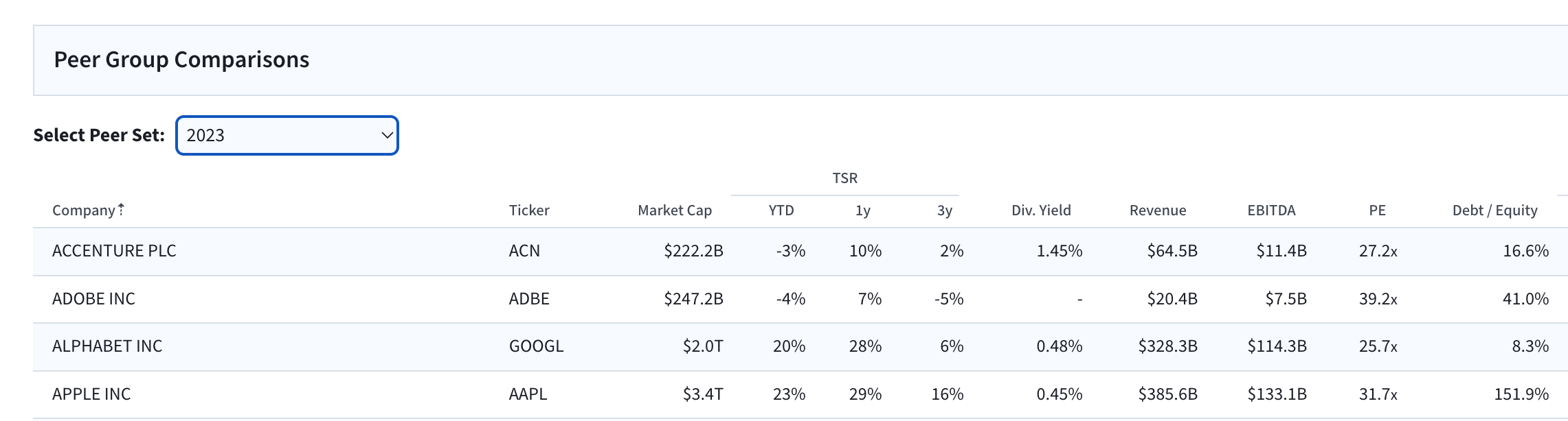 - Industry peer comparisons -- on every company's "Overview" page in the "Peer Comparison" section -- enables users to make informed decisions and gain a comprehensive understanding of a company’s standing within its competitive landscape.