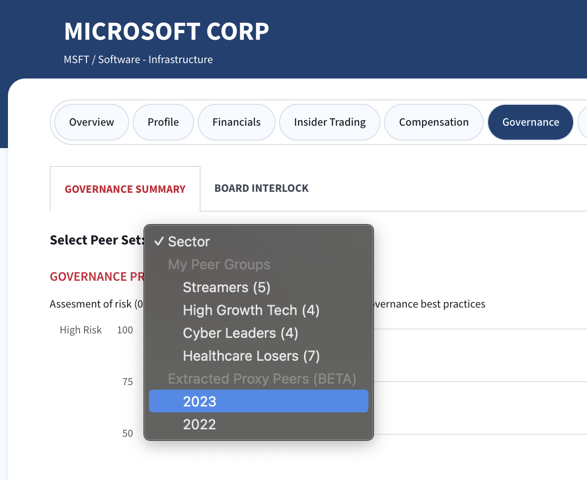 - Governance analytics -- on every company's "Governance" page -- offers deep dives into board composition and effectiveness, comparing them against peer companies.