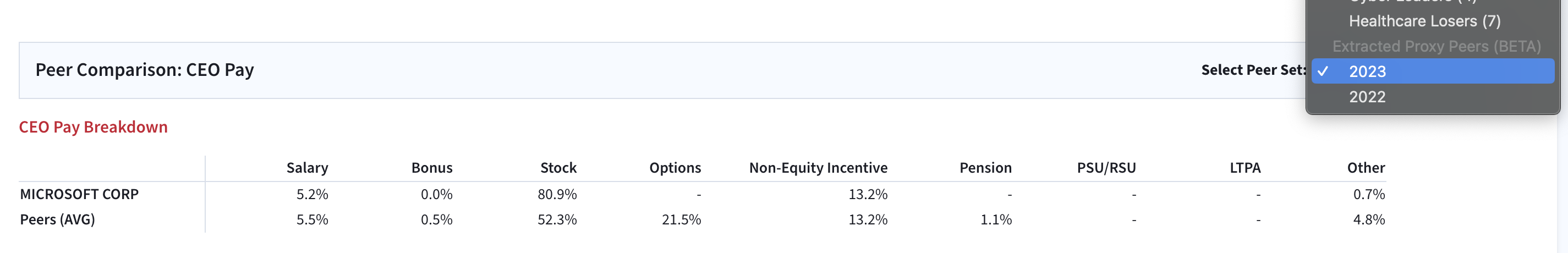 Boardroom Alpha's platform leverages advanced data extraction techniques to seamlessly identify and extract proxy peers from proxy filings. The platform now captures important company-disclosed information on peer companies that are used for executive compensation benchmarks, governance comparisons, and performance evaluations. This extracted data is then organized and made readily accessible within the platform, allowing users to draw insights from the peer groups that companies themselves identify in their filings.