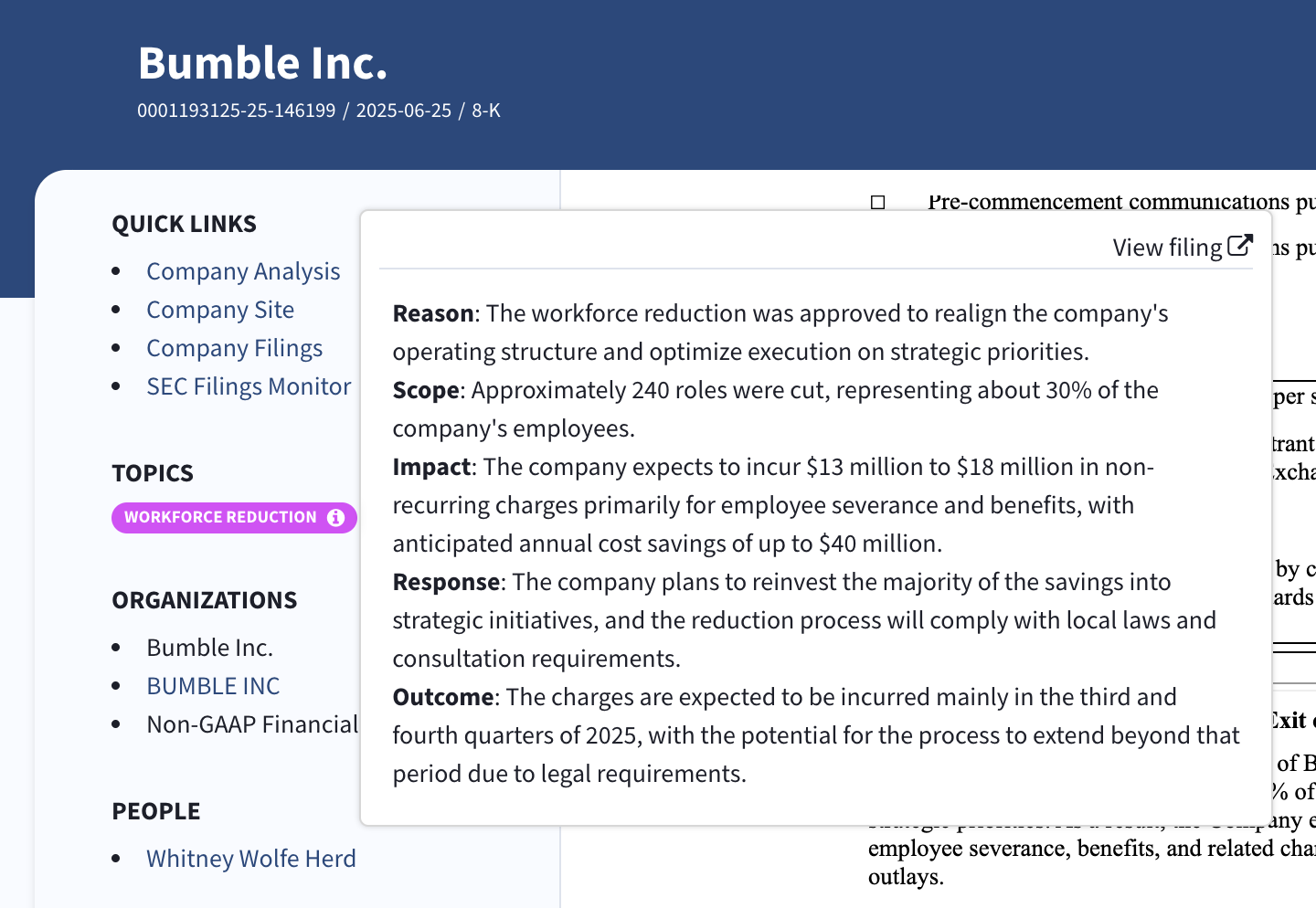 Highlights are generated using our AI-driven natural language engine, which identifies and extracts text related to known red flag triggers (such as “resignation,” “termination,” or “plan of reorganization”).